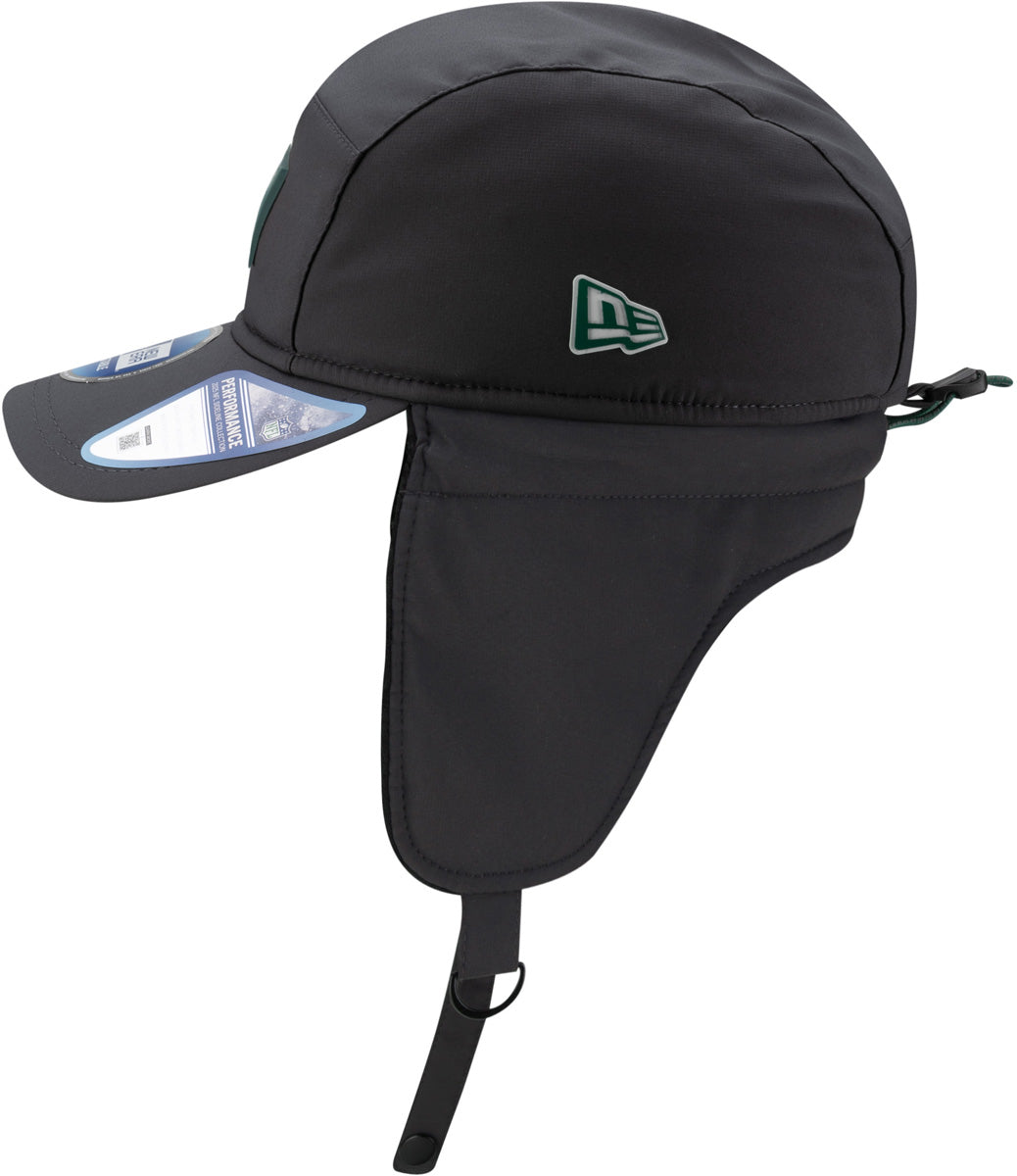 Green Bay Packers New Era Sideline 2025 Cold Weather Runner Dog Ear Adjustable Cap. Official Sideline NFL Team merchandise. Black wipe clean fabric, the Stitch detail front panel, with the Rubberized Green Bay Packers front logo, the New Era flag side logo, the NFL rear logo, and the adjustable rear toggle. The cap is fully fur lined, with t...