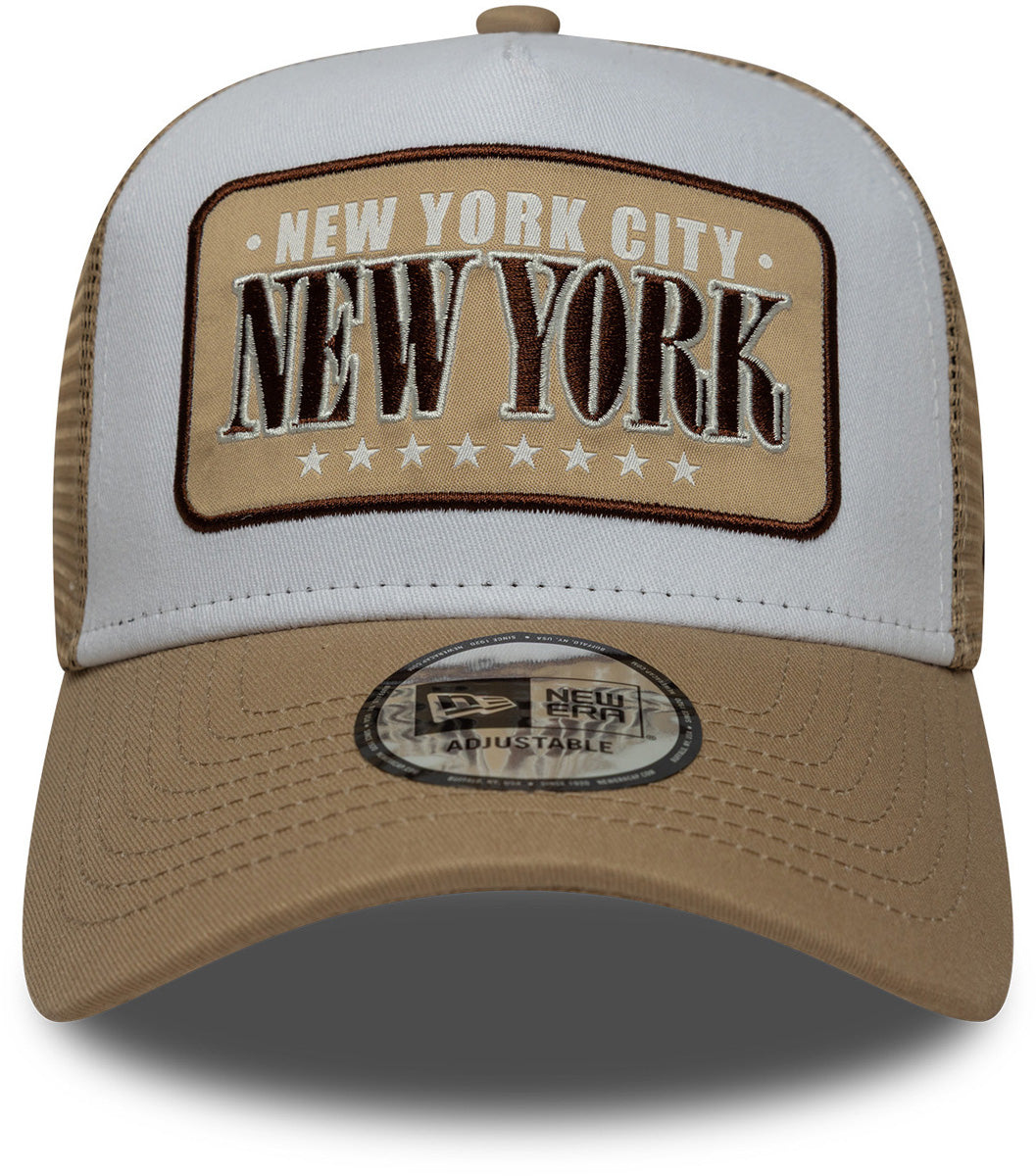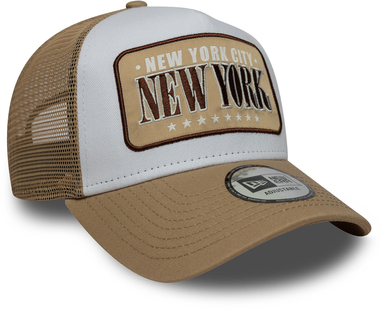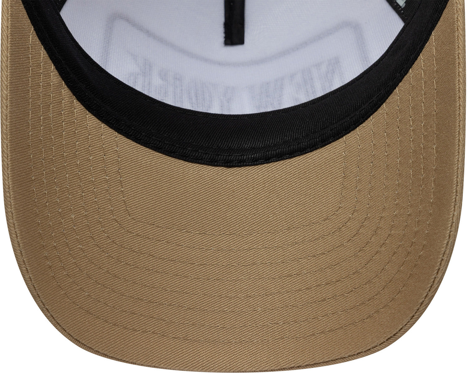 New York Yankees New Era League Essential Stone Trucker Cap. Structured front crown, mesh rear panels, and the Curved Visor. Stone colour, with the officially licensed New York Yankees, 'NY' front logo, and the New Era Flag side logo, on the Tonal mesh backing. Adjustable Snapback rear strap. Size range- 54.9cm - 61.5cm (6+7/8 - 7+3/4)